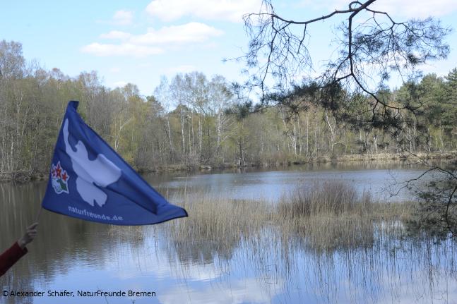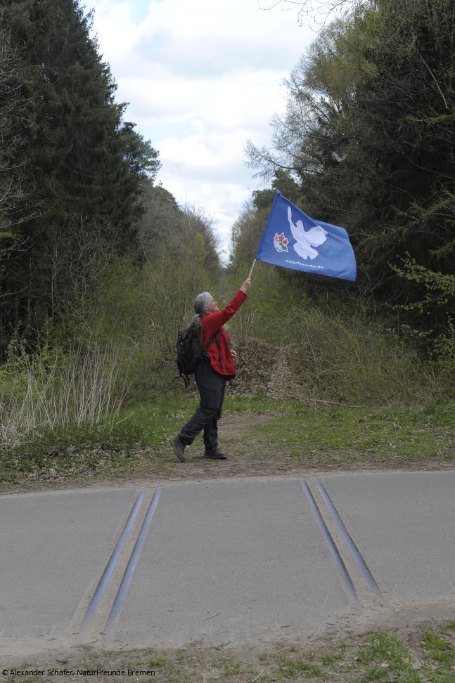 Unsere Friedenswanderung im Rahmen der Aktionstage für den Frieden im April 2021 haben wir Bremer Wanderleiter*innen in der Garlstedter Heide im kleinsten Kreis unternommen. Stellvertretend für die NaturFreunde Bremen und alle Mitwander*innen haben wir mit der NaturFreunde-Friedensfahne die Spuren der militärischen Nutzung dieses Naherholungsgebietes nordwestlich von Bremen aufgesucht.